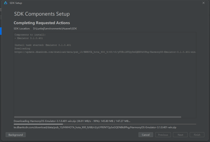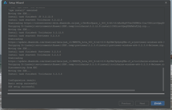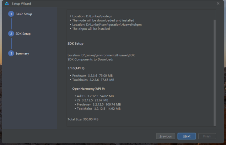之后来到环境配置页面。环境配置就相当于DevEco Studio要正确运行还要依赖别的东西。必须要吐槽一下,像这种开发工具环境配置的东西,安装工具时就不能默认配置好一下吗?是开源协议不允许这打包还是用别人的东西都懒得去开发了啊?