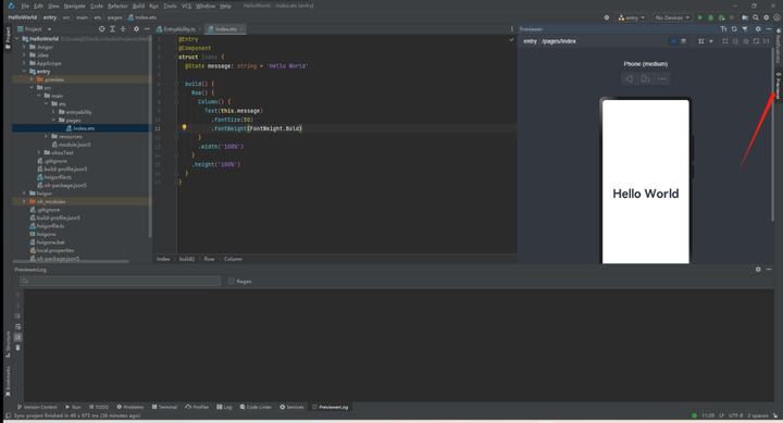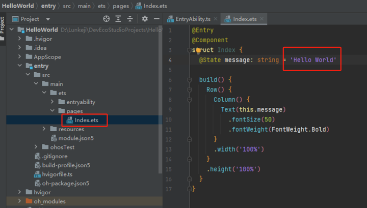 你看这IDE(指集成开发环境,如这个DevEco Studi)默认打开的这个文件,从左边我们知道它在电脑中的目录结构的位置是存放在哪里。右边则显示的是这个文件的源代码。源代码里面就看到有"Hello World"字样,想改变显示的文字直接替换就可以了,这样看是不是非常简单了?