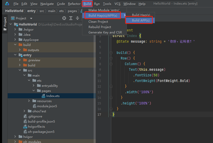 最后,想要手机上安装该APP,需要编译成手机能看懂的机器代码,在Build菜单中选择Build Hap(s)/APP(s)>Build APP(s)即可完成APP的打包。