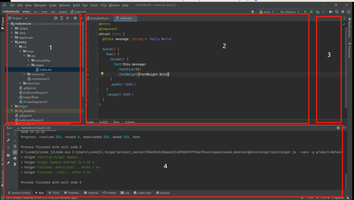 这个IDE主要分成4个区域,左边1区域显示了项目的工程文件目录结构,中间2区域是代码编辑区,写小作文就是在这个区域编写。右边3区域是手机上显示的效果预览区,要点击旁边的“Previewer”预览按钮才生效。底部的4区域则是显示运行结果通知信息,让你掌握软件的运行的各种信息,它底下还有很多选项卡,可以切换显示通知的内容。