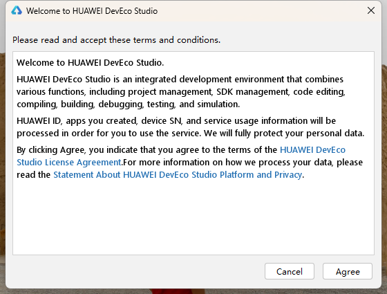 首次运行同意协议就开启鸿蒙应用开发之旅了