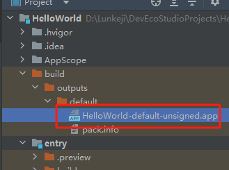 生成的APP就存放在项目目录下\build\outputs\default的目录里面,那个.app后缀的文件就是了。