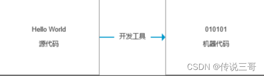 为了得到这个Hello World,你需要得到这个Hello World的源代码,源代码是用人比较容易看得懂的计算机编程语言规范写的小作文。编程语言就相当于你使用的中文类似,你写的小作文就是源代码,源代码是写给人看的。但是计算机是不懂看这些源代码的,需要借助一个工具把源代码翻译成机器能理解的机器代码,也就是计算机能执行的01机器代码。计算机怎么只能执行01代码这就涉及比较深的知识了,就不细讲了,不用理解也不影响写小作文。