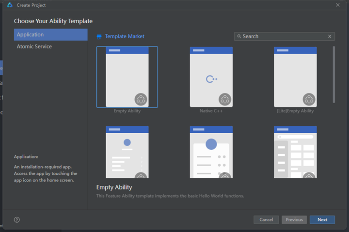创建项目页面有很多预设的模板可以选择,这就像给你写了不同类别的作文写作参考范本。让你知道在鸿蒙上议论文怎么写、说明文怎么写有个参考!就选第一个“Empty Ability”,我的理解是一张空的纸,写个Hello World足够了。