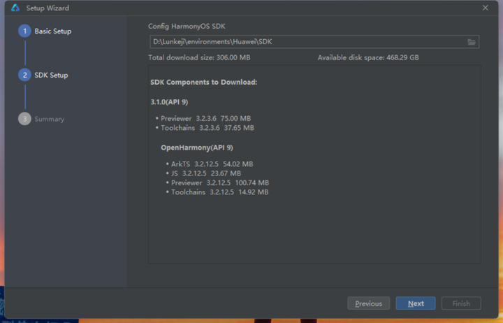 来到SDK配置页面,SDK是鸿蒙一系列开发工具包,选择要安装的目录即可。