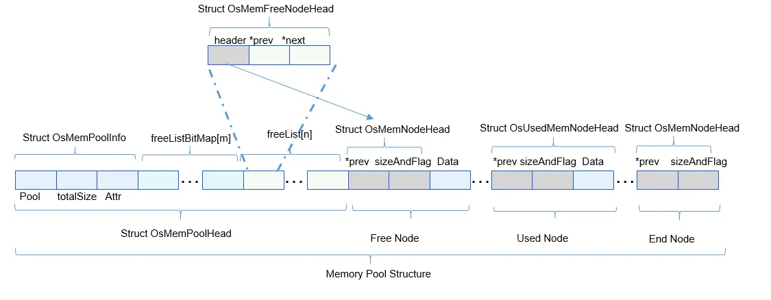 - 内存池池头部分 内存池池头部分包含内存池信息、位图标记数组和空闲链表数组。内存池信息包含内存池起始地址及堆区域总大小,内存池属性。位图标记数组有7个32位无符号整数组成,每个比特位标记对应的空闲链表是否挂载空闲内存块节点。空闲内存链表包含223个空闲内存头节点信息,每个空闲内存头节点信息维护内存节点头和空闲链表中的前驱、后继空闲内存节点。