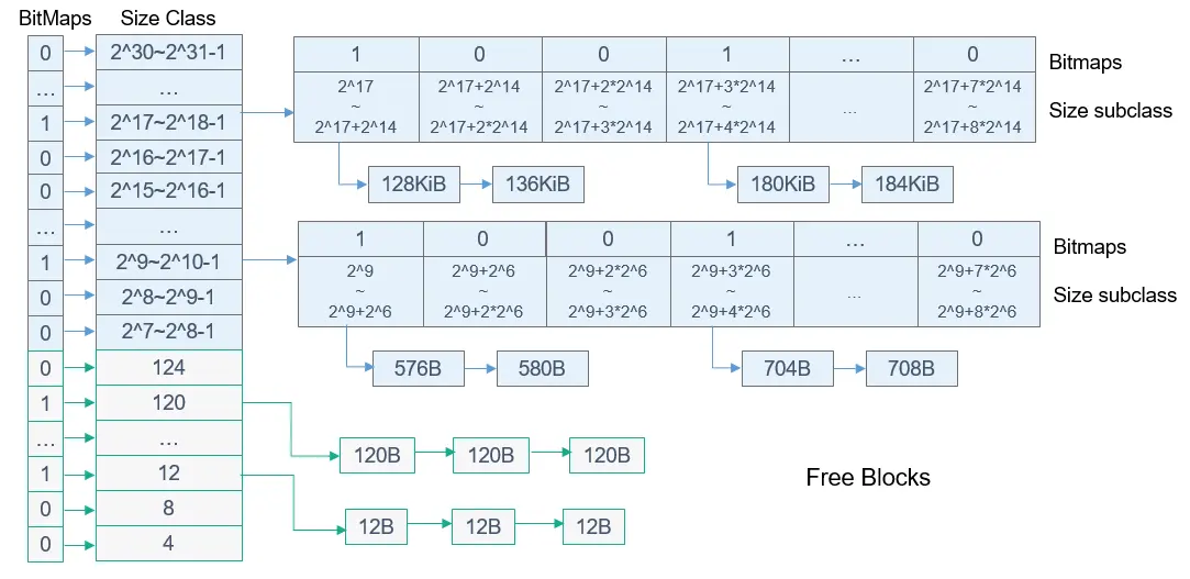 - 大于127字节的空闲内存块,按照2的次幂区间大小进行空闲链表管理。总共分为24个小区间,每个小区间又等分为8个二级小区间,见上图上半部分的Size Class和Size SubClass部分。每个二级小区间对应一个空闲链表和用于标记对应空闲内存链表是否为空的一个比特位。总共24*8=192个二级小区间,对应192个空闲链表和192个比特位进行标记链表是否为空。