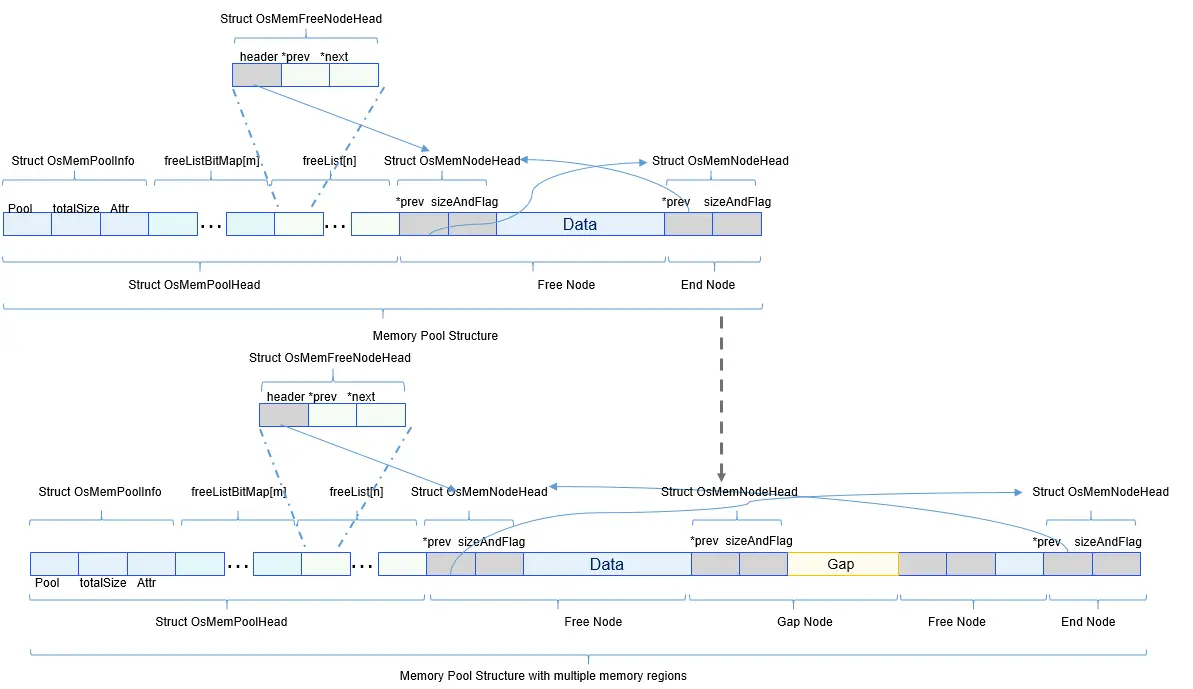 - 把内存区域间隔部分视为虚拟的已使用节点,使用上一个内存区域的尾节点,设置其大小为gapSize + OS_MEM_NODE_HEAD_SIZE(即sizeof(struct OsMemUsedNodeHead))。