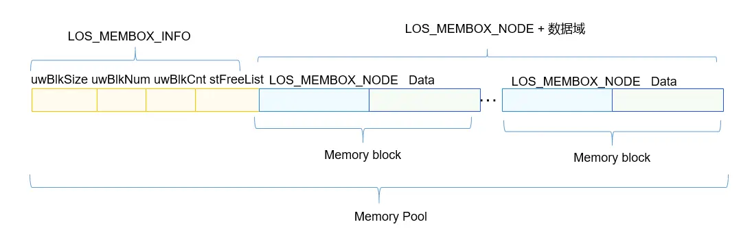 静态内存池由一个控制块LOS_MEMBOX_INFO和若干相同大小的内存块LOS_MEMBOX_NODE构成。控制块位于内存池头部,用于内存块管理,包含内存块大小uwBlkSize,内存块数量uwBlkNum,已分配使用的内存块数量uwBlkCnt和空闲内存块链表stFreeList。内存块的申请和释放以块大小为粒度,每个内存块包含指向下一个内存块的指针pstNext。