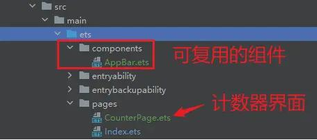 之前计数器的所有代码都放在 Index.ets 中,会让入口代码显得冗长。根据功能需求,计数器是一个独立的功能;另外其中的 AppBar 组件其他界面可以复用。所以可以进行如下调节:创建 components 文件夹,盛放打算复用的封装组件,将 AppBar 组件单独分文件维护;在 pages 文件夹下,创建 CounterPage 维护计数器的功能需求。