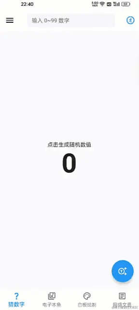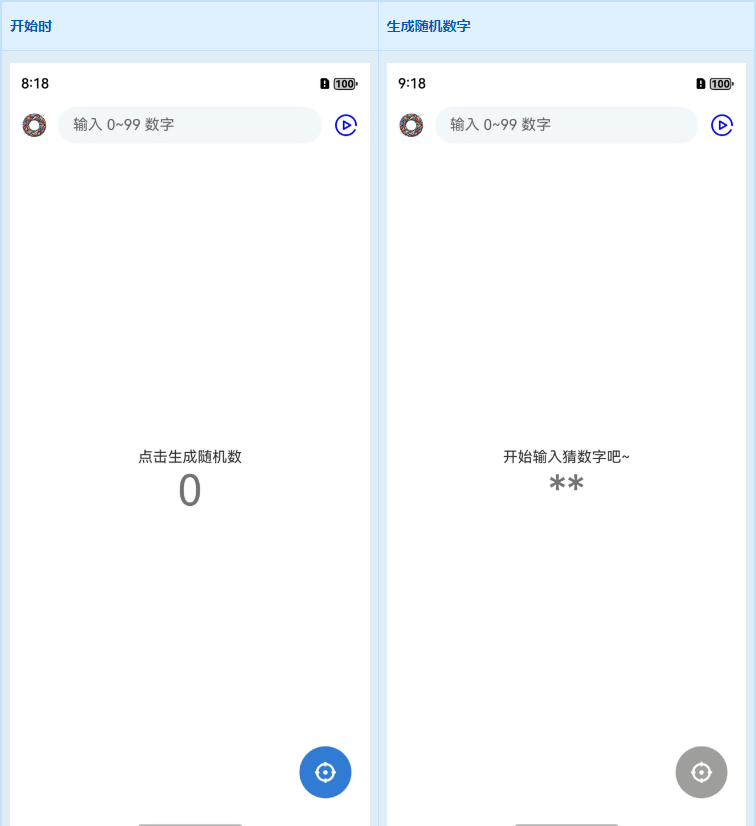 点击按钮生成 0~99 的随机数,并将随机数密文隐藏。头部的输入框,点击时弹出软键盘,可输入猜测的数字。如下所示,点击右上角的运行按钮,可以比较输入猜测值和生成值的大小,并在界面上通过两个色块进行提示。每次比较时,提示面板中的文字会有动画的变化,给出交互示意。这三个交互就是本案例的所有功能需求。你可以找几个朋友一起玩这个猜数字的小游戏,比如随机生成一个数后,每人输入一个数,最后猜中的人获取胜利。其