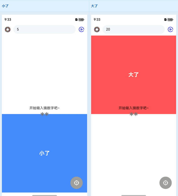 当点击运行时,会检测当前输入和目标值的大小关系。并以红色和蓝色的区域提示用户。其中红蓝各占高度的一半;文字展示在色块中间。在布局上,红蓝色块可以叠放在底层,根据猜测的状态值决定展示效果: