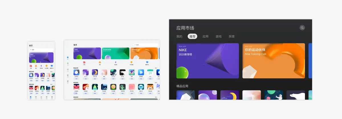 例如:默认设备上的滚动banner,在其他设备上可进行延伸,平板上露出更多banner,大屏上完全显示两张。