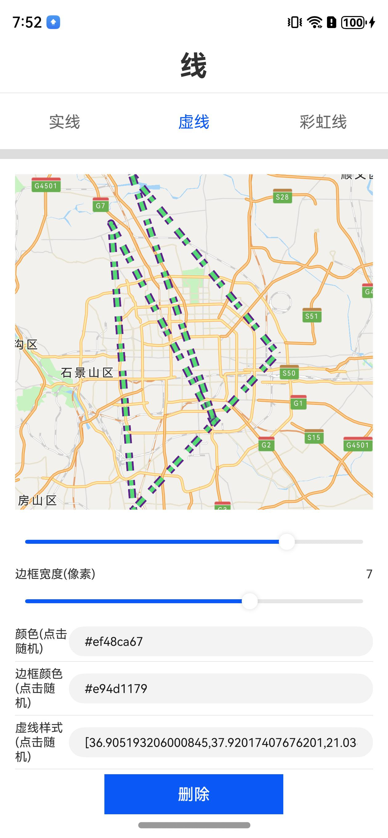 | pattern | 虚线样式,偶数个,含义[实部长度1, 虚部长度1, 实部长度2, 虚部长度2…],单位是像素(px) |
