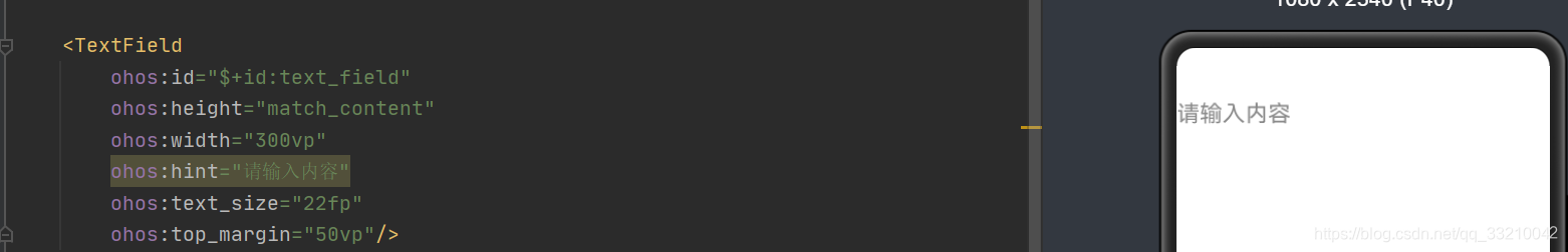 TextField 是什么TextField是HarmonyOS 里面的输入框TextField 的属性TextField 继承Text 所以Text的属行也适用TextField ,需要记住的几种属性有hint 提示文本hint_color 提示语字体的颜色text_size 字体的大小,即使提示语字体的大小也是输入文本字体的大小TextField 自有的属性basement :输入框基线下面认