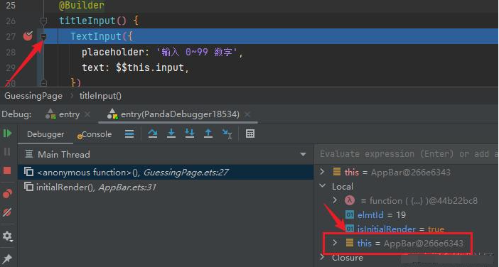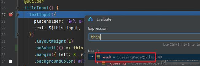 在开发过程中遇到一个非常坑的点,在 GuessingPage 中定义的 titleInput 插槽,在运行时无法访问到类中的状态成员。结果调试发现,直接将 titleInput 作为入参传给 AppBar ,运行该方法的 this 居然是 AppBar。怪不得无法访问 GuessingPage 中的成员呢。