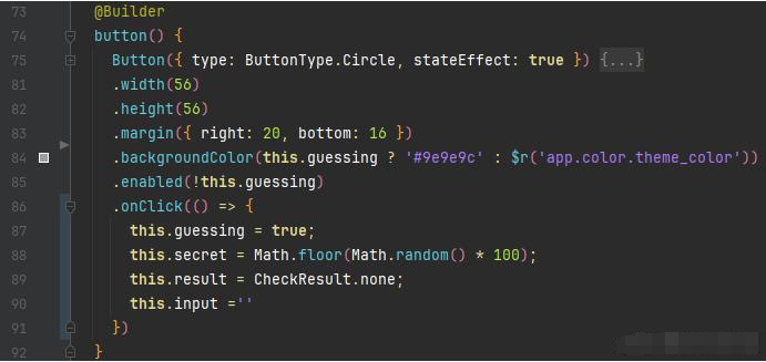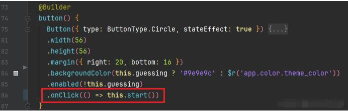 start(): void { this.guessing = true; this.secret = Math.floor(Math.random() * 100); this.result = CheckResult.none; this.input ='' }在 Button 的 onClick 事件中,触发