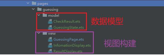 如下所示,将 GuessingPage.ets 的代码按照类型和功能进行整理,放入 page/guessing 文件夹下;实现其中主要包括 状态数据的维护 和 界面构建逻辑 ,分别将它们放入 model 和 view 文件夹下。这样一眼就能看到,那个文件在负责哪件3事:
