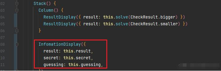 比如中间的介绍信息,需要依赖 result、guessing、result 三个状态数据;我们可以将其封装为 InfomationDisplay 组件,来单独维护中间区域的界面构建逻辑。在主界面构建时,只需要使用该组件,传入数据即可: