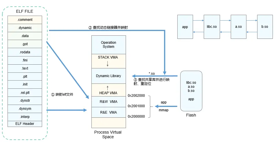 程序执行时,虚拟内存区间若无具体的物理内存做映射,系统将触发缺页中断,将elf文件内容读入物理内存,并将该内存块加入pagecache。