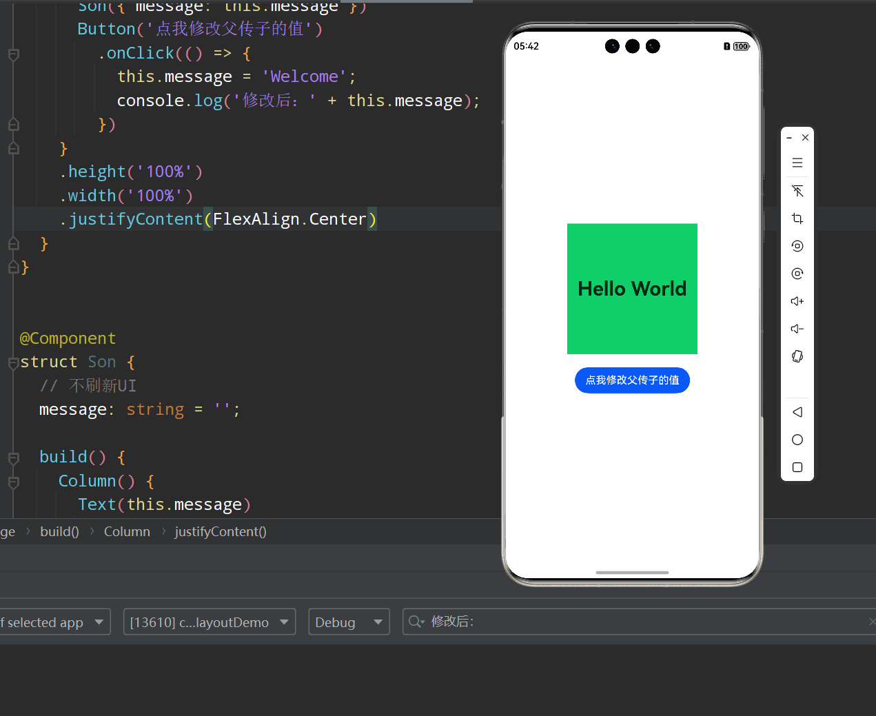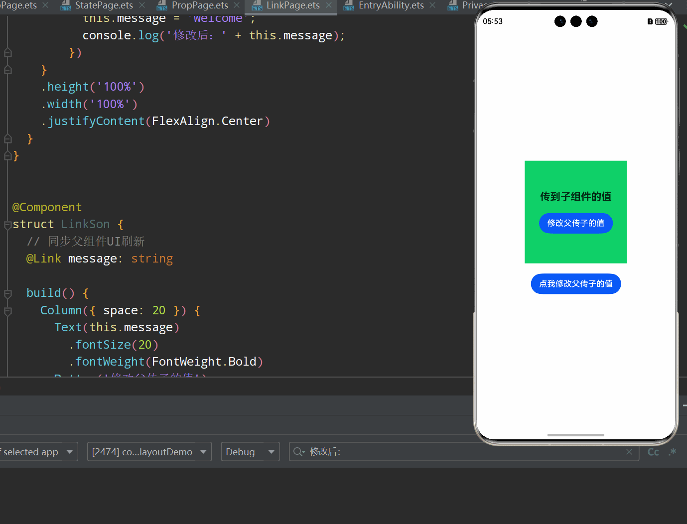 在这个案例中子组件LinkSon使用@Link接收了来自父组件的message,无论是子组件的数据改变还是父组件的数据改变都会触发数据的更新