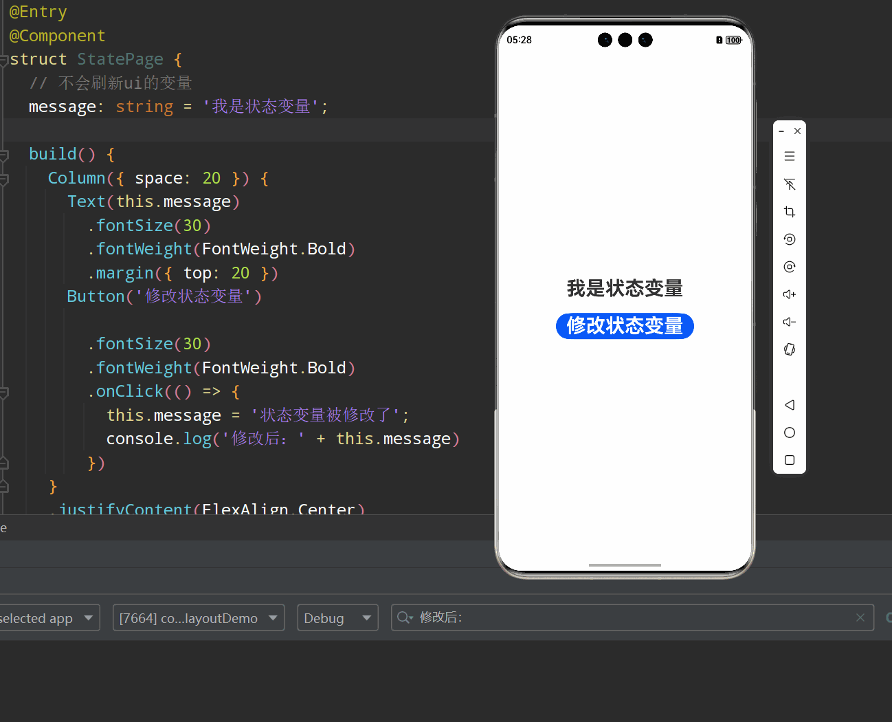 若message这个变量没有被@State修饰的话,message的值会变,而UI界面不会刷新,效果如下: