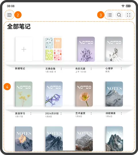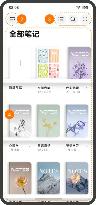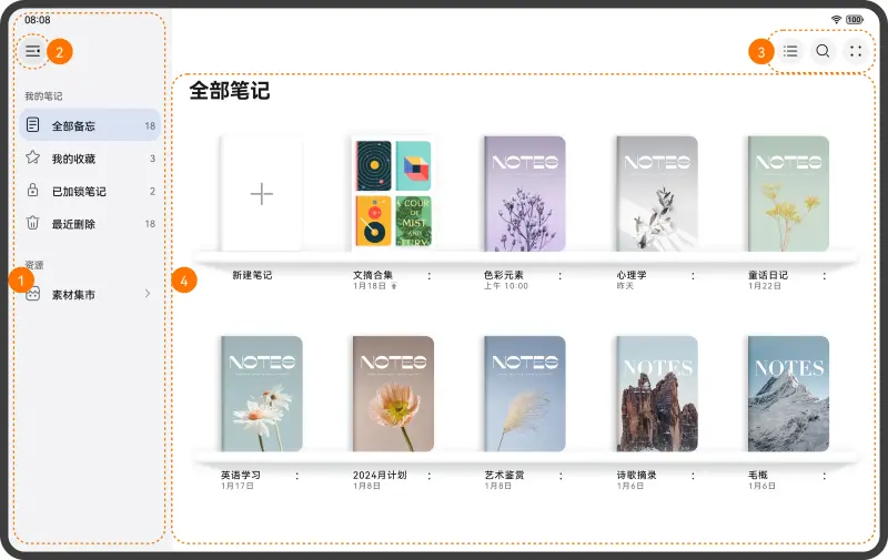 - 将笔记汇总页划分为4个部分,效果图如下: