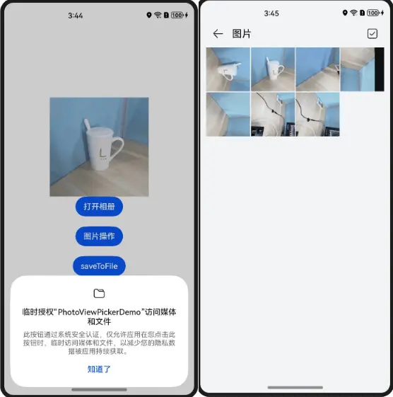 集成保存控件后,当用户点击该控件时,应用会获得10秒内单次访问媒体库特权接口的授权。这适用于任何需要将文件保存到媒体库的应用场景,例如保存图片或视频等。