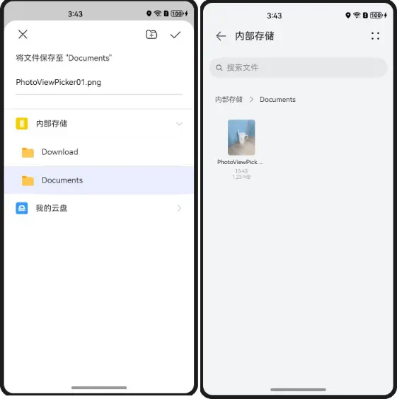 调用 save() 接口拉起FilePicker界面进行文件保存。用户选择目标文件夹,用户选择与文件类型相对应的文件夹,即可完成文件保存操作。保存成功后,并用一个全局变量存储返回的uri。