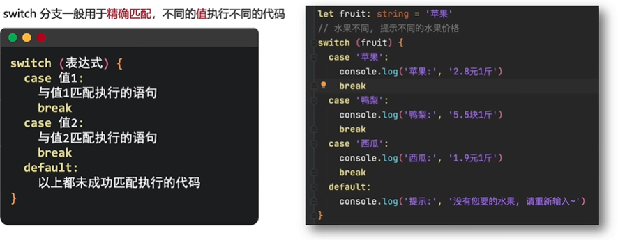switch分支一般用于精确匹配, 不同的值执行不同的代码