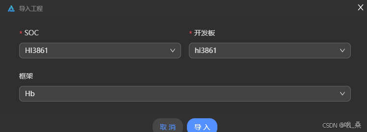 在后续导入工程弹窗,SOC栏选择Hi3861,开发板栏选择hi3861,框架栏选择hb,之后