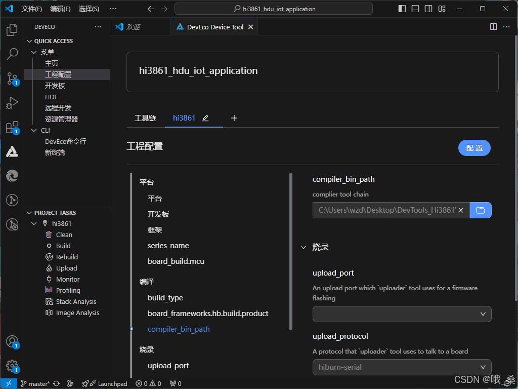配置开发工具路径,点击左侧的“工程配置”,在右侧窗口找到“compiler_bin_path”,选择