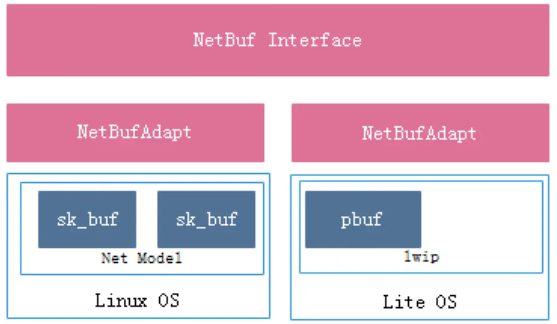 NetBuf 部件为 WLAN 驱动提供 Linux 或者 LiteOS 原生的网络数据缓冲的统一数据结构的封装以及对网络数据的操作接口的封装,框架如下图所示: