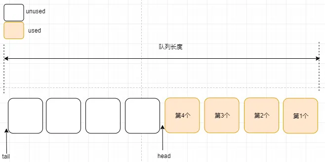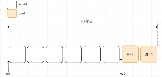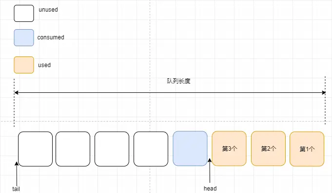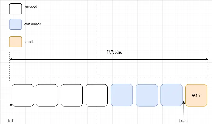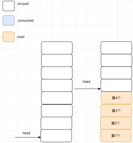 消费后的消息空间也是unused空间,在此处用其它颜色标注消费后的消息,便于读者理解队列的变化情况。