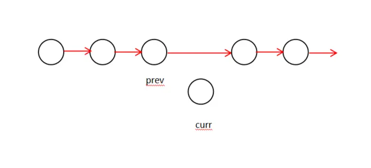 如上图所示,当在遍历过程中删除了curr节点时,那么通过它找到下一个节点是不可能了。所以这个时候我们必须借助操作curr之前还在链表上的上一个节点,即上图的prev节点,通过其next成员,找到需要迭代处理的下一个节点。所以,迭代过程中需要记录prev、curr这2个节点的位置信息。迭代过程实际就是调整prev和curr的过程,对于不删除的情况,prev和curr依次向后移动,删除操作时,只移动curr。