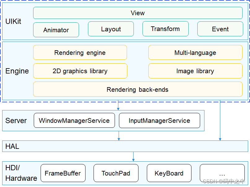 图形UI组件实现了一套系统级的图形引擎。该组件为应用开发提供UIKit接口,包括了动画、布局、图形转换、事件处理,以及丰富的UI组件。组件内部直接调用HAL接口,或者使用WMS(Window Manager Service)提供的客户端与硬件交互,以完成事件响应、图像绘制等操作。图 1图形子系统架构图。