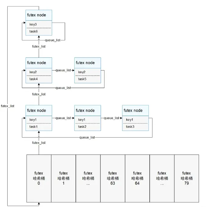 哈希桶共有80个,0~63 号桶用于存放私有锁(以虚拟地址进行哈希),64~79号桶用于存放共享锁(以物理地址进行哈希),所有相同的 key都掉进了同一个桶里。私有/共享属性通过用户态锁的初始化以及Futex系统调用入参确定。