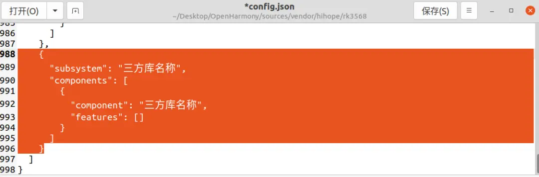 ④产品引用:把子系统及其组件加入产品定义中,以rk3568为例,产品定义文件存在vendor/hihope/rk3568/config.json,以下内容添加到config.json中: