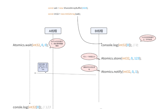 Atomics提供wait()和notify()机制,采用的是Linux上的 futex 模型(“快速用户空间互斥体”),可以让进程一直等待直到某个特定的条件为真,主要用于实现阻塞。B线程启动后,第一行代码可以如期打印出初始化的0,紧接着,向SharedArrayBuffer中第0号位,写入了123,然后再调用了notify,发送出一个解锁通知。如果数组中指定的元素与给定的值相等,则将其更新为新的