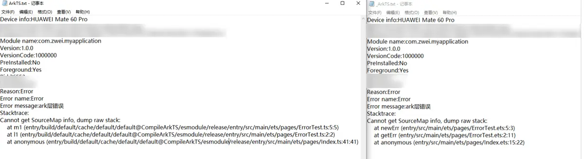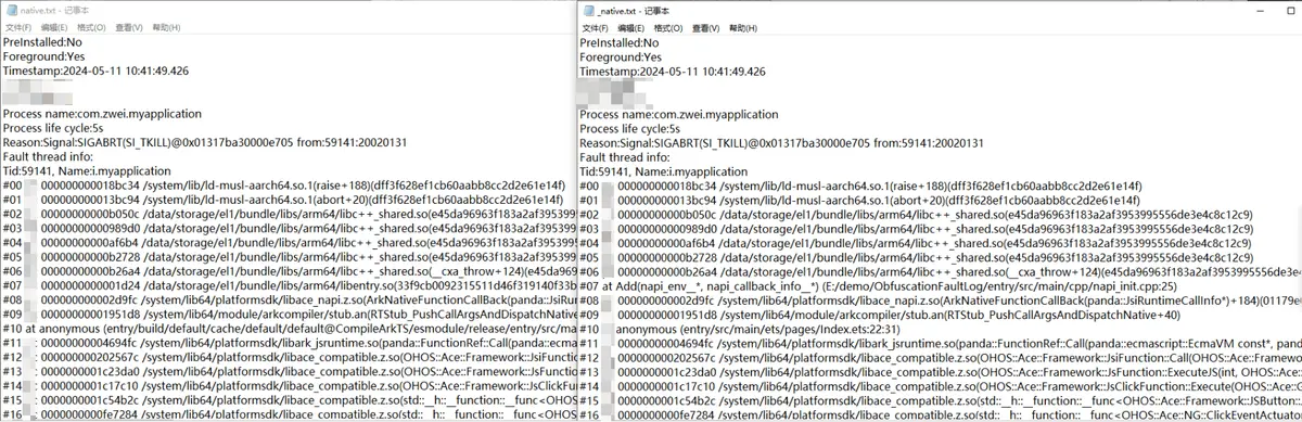 两次运行工程分别点击工程内的Native按钮和ArkTS按钮获取混淆后的报错日志。