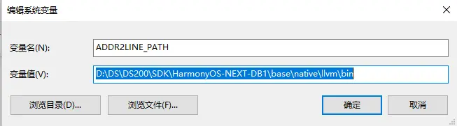 b.如果需要对C++文件产生的异常进行解析,则需要将SDK中的native\llvm\bin目录配置到环境变量中,变量名设置为“ADDR2LINE_PATH”(路径的文件名不能包含空格)。