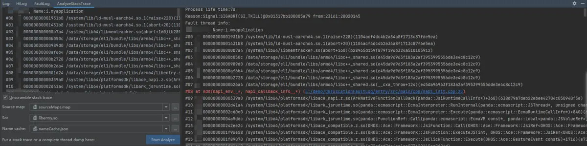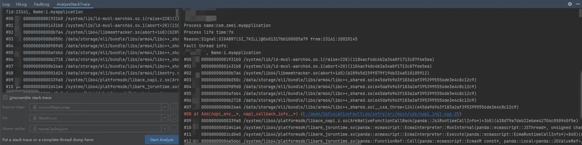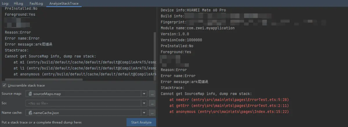 打开Analyze Stack Trace工具栏,勾选Unscramble stack,分别添加应用对应的sourceMaps.map文件、nameCache.json文件和对应的so文件,点击Start Analyze即可进行解析: