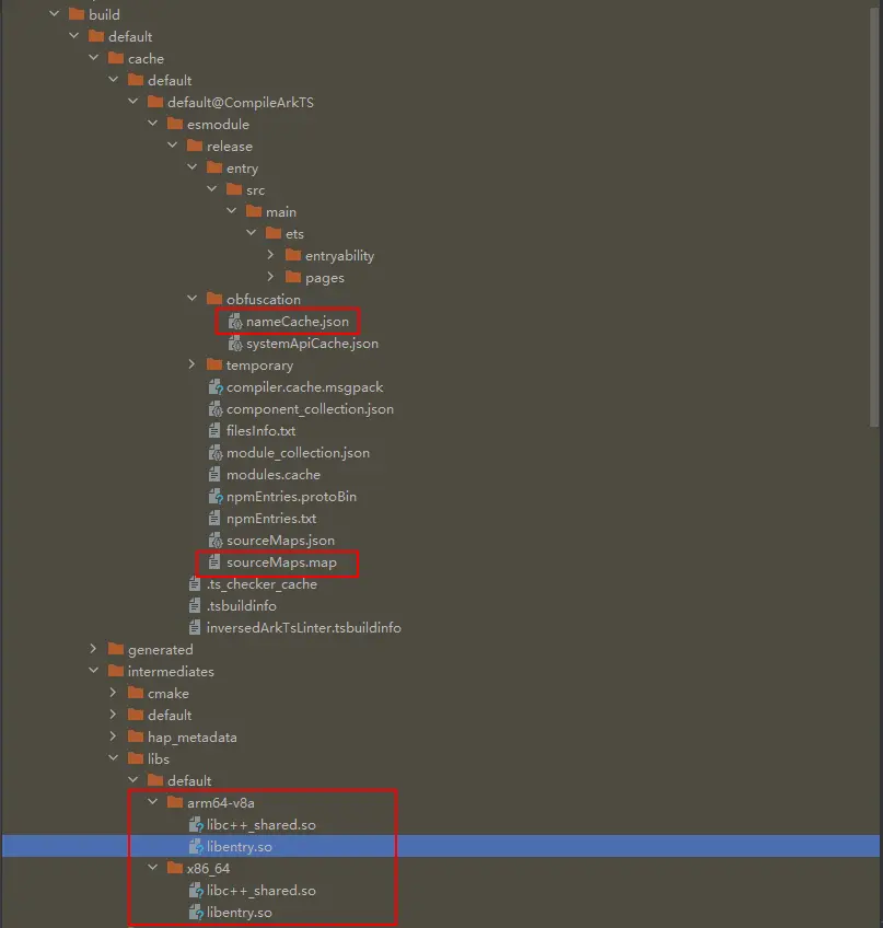 2.获取原工程混淆后build产物目录下的sourceMaps.map文件,nameCache.json文件,以及生成的so文件(根据运行的设备的CPU架构选取对应的so文件)产物路径参考下图: