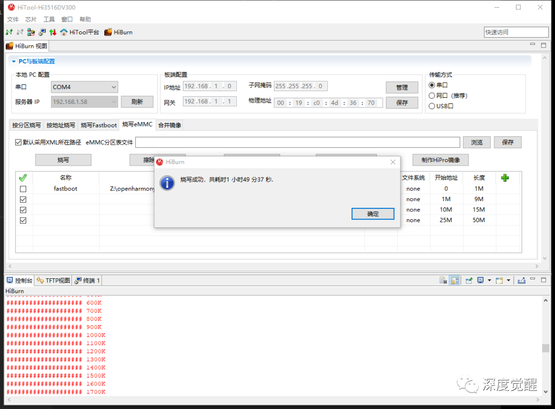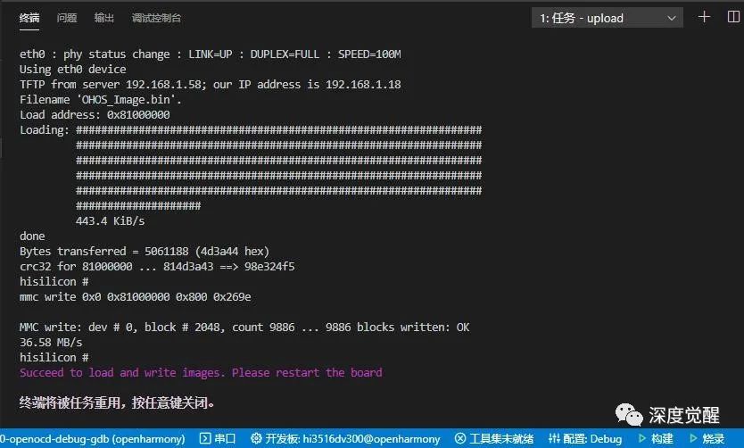 一切顺利的话,看到提示重启开发板,就能写入成功,网络烧录速度还是非常快的。