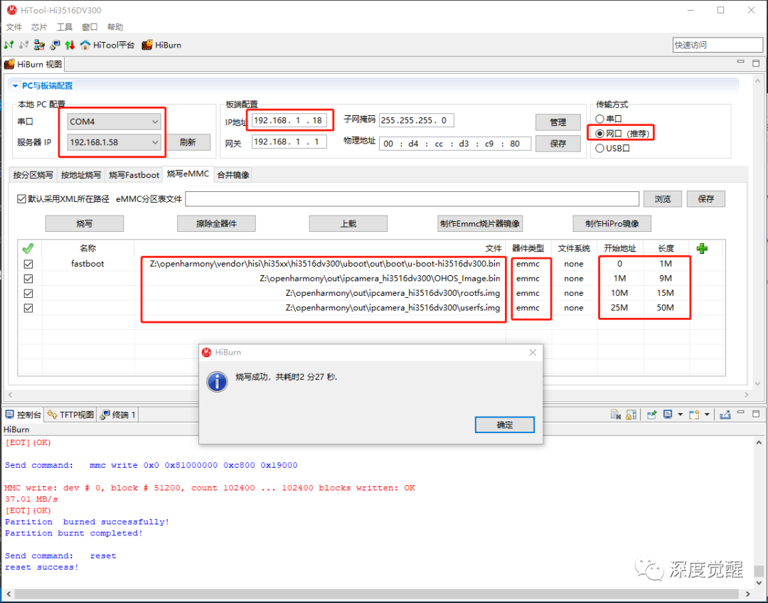 参数设置见下图,不多叙述了。网络烧录则速度快得多,2 分钟搞定!