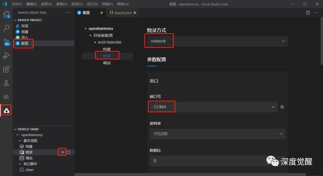 打开 vscode,点击 配置-烧录,选择烧录方式为 network;选择对应的串口号(这里是COM4)