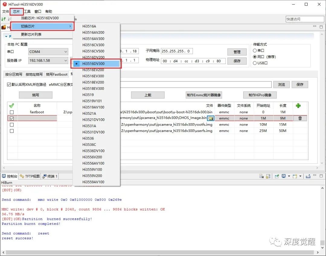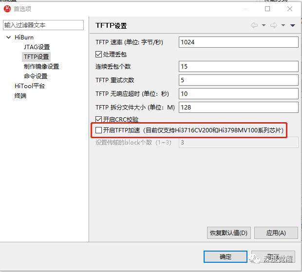 菜单窗口-首选项-TFTP设置里,由于Hi3516DV300不支持加速功能,取消这个配置的复选框。