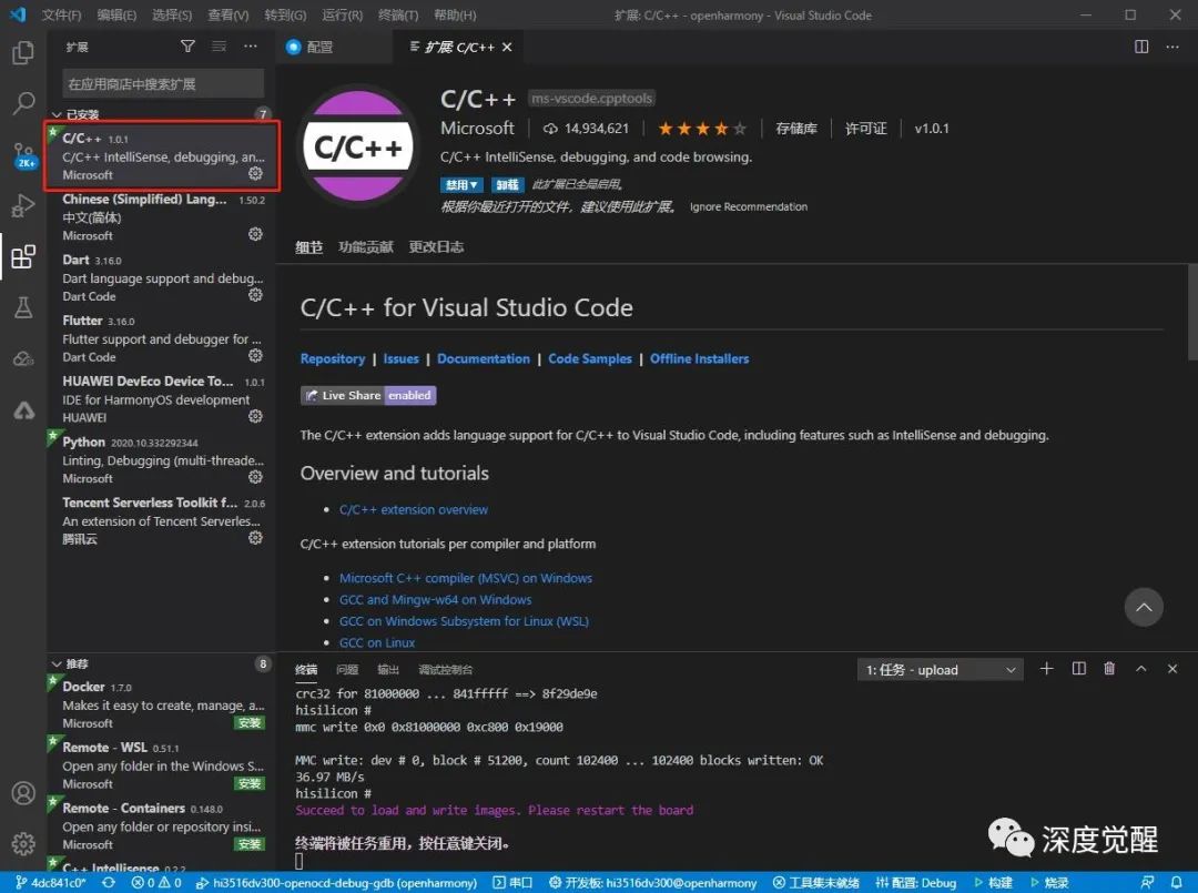 HarmonysOS设备开发采用C/C++语言,Visual Studio Code工具对C/C++语言的支持插件非常丰富,可以安装“C/C++”插件来实现C/C++代码智能提示、代码高亮、格式化等功能,帮助您更高效、便利的开发更规范和优美的代码。