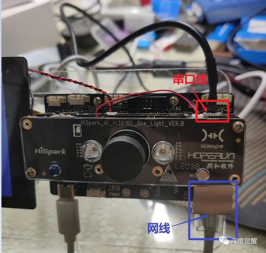 「这里注意,一定要同时插串口线和网线,因为即使是网口烧录方式,网络配置命令和fastboot段都是通过串口传输的。」
