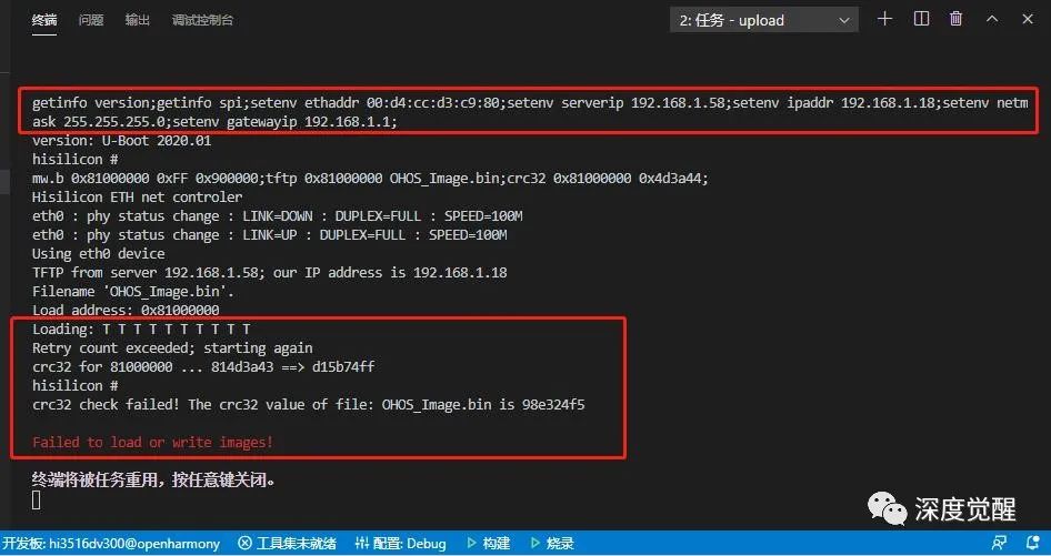 如果网络地址完全正确(仔细查看setenv命令参数),遇到 crc32 校验错。